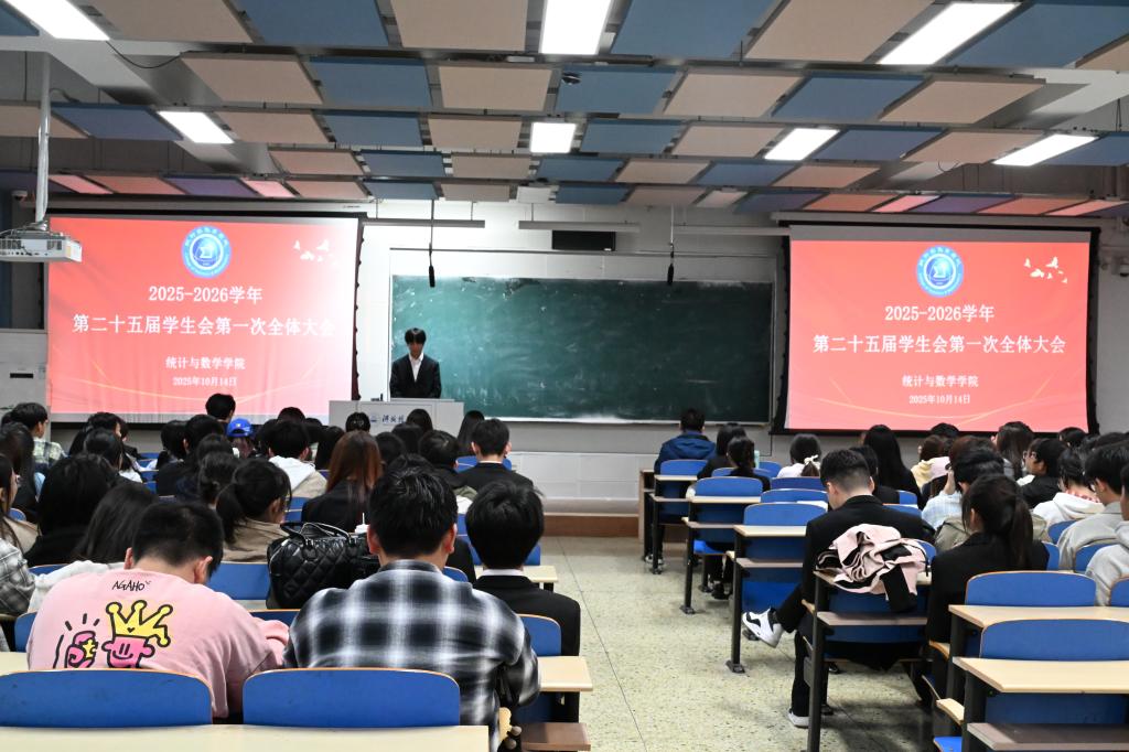 10月14日晚7点,统计与数学学院第二十五届学生会于北三教A101召开2025-2026学年第一次全体大会,院团委书记王洋老师、主席团成员、各部门部长以及全体2025级学生会新成员参加,会议由办公室部长赵佳豪主持。