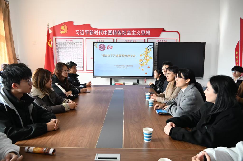 正值河北经贸大学2025年金秋银杏节盛大开幕之际,又逢我院成立40周年。11月8日,统计与数学学院于第四办公楼学院会议室隆重举行“银杏树下又逢君”建院40周年校友座谈会。院党委书记祃海霞、党委副书记路荣参加活动。